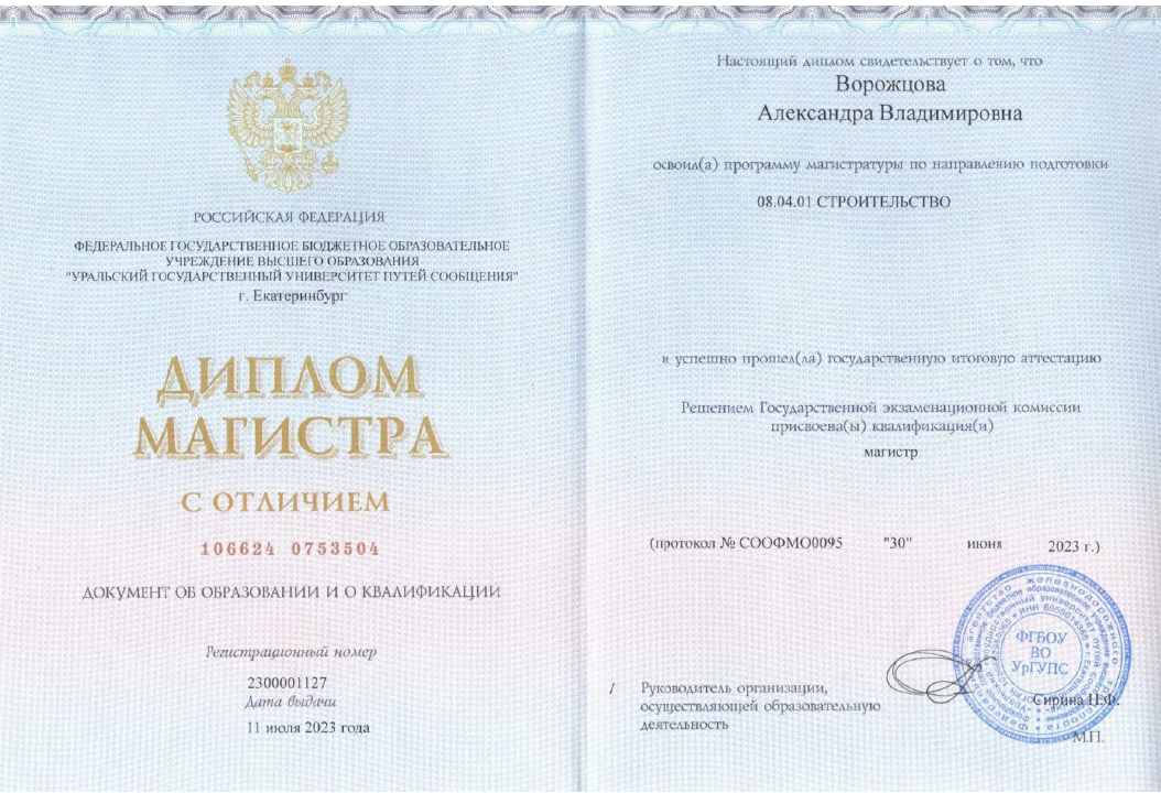- диплом магистра по направлению «Строительство» (рег. номер 2300001127, выданный 11.07.2023 г. ФГБОУ ВО УрГУПС – Уральский государственный университет путей сообщения);