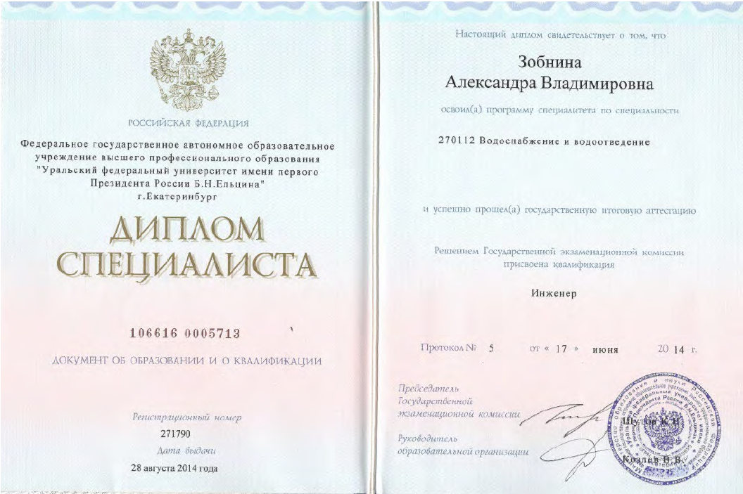 - высшее строительно-техническое образование по специальности «Водоснабжение и водоотведение» (рег.номер 271790, выданный 28.08.2014 г. ФГАОУ ВО УрФУ – Уральский федеральный университет имени первого Президента России Б.Н. Ельцина);