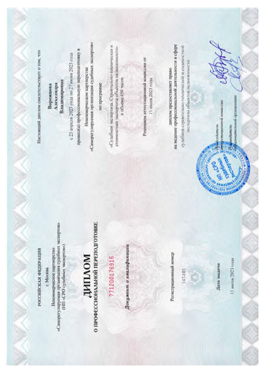 - диплом о профессиональный переподготовке по программе «Судебная экспертиза. Строительно-техническая и стоимостная экспертиза объектов недвижимости» (рег. номер 147-НП, НП «СРО судебных экспертов»);