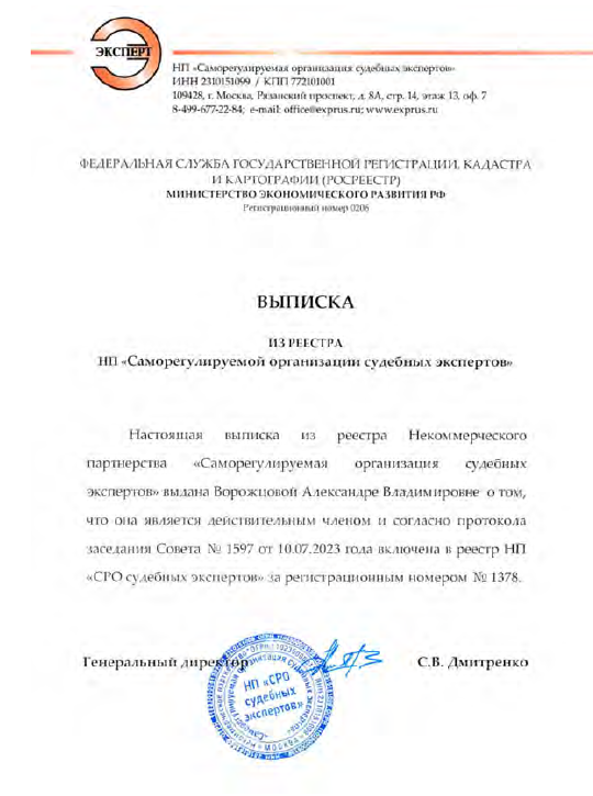 - Является членом НП «Саморегулируемая организация судебных экспертов», согласно протокола заседания Совета №1597, включена в реестр НП «СРО судебных экспертов» за регистрационным номером №1378 https://exprus.ru/experts/8574
