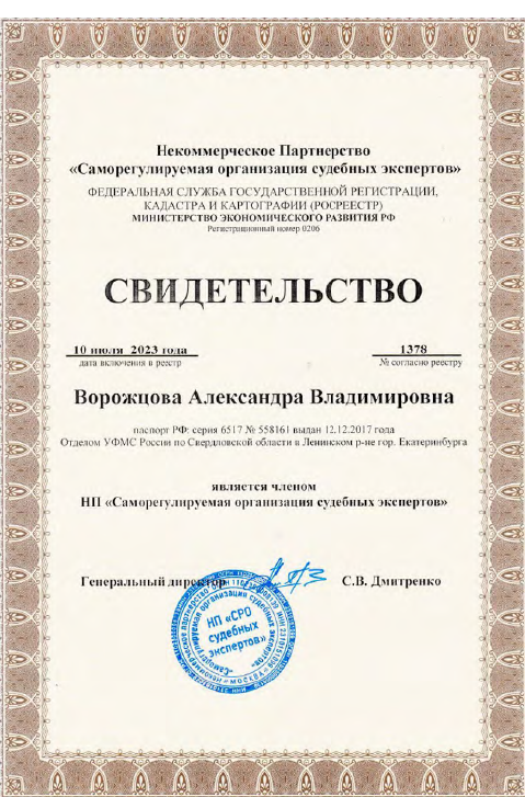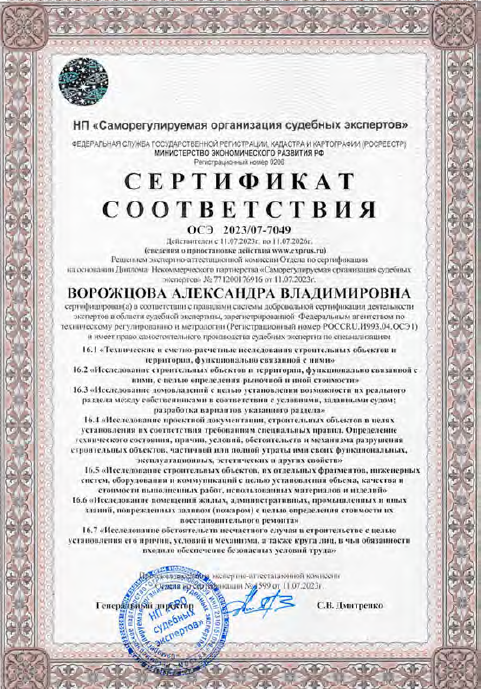 - сертификат соответствия судебного эксперта ОСЭ 2023/07-7049, дающий право производства судебных экспертиз по специализациям: «16.4. Исследование проектной документации, строительных объектов в целях установления их соответствия требованиям специальных правил. Определение технического состояния, причин, условий, обстоятельств и механизма разрушения строительных объектов, частичной или полной утраты ими своих функциональных, эксплуатационных, эстетических и других свойств», «16.5. Исследование строительных объектов, их отдельных фрагментов, инженерных систем, оборудования и коммуникаций с целью установление объема, качества и стоимости выполненных работ, использованных материалов и изделий»;
