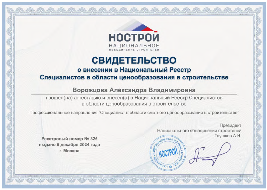 - включен в Национальный реестр специалистов в области ценообразования в строительстве. Сведения размещены на официальном сайте «НОСТРОЙ» https://nostroy.ru/ в разделе «Национальный реестр специалистов» в разделе «Актуальное» рег. номер №326