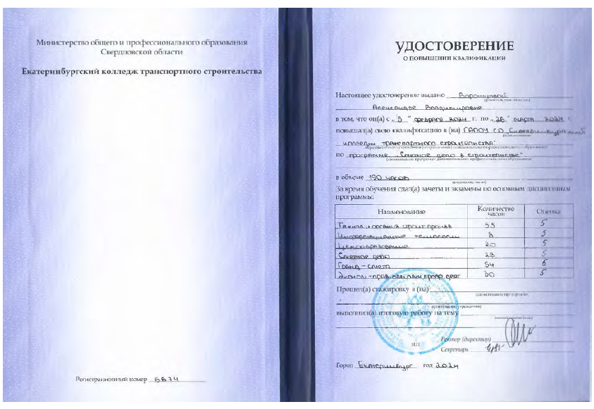 - удостоверение о повышении квалификации ГАПОУ СО «ЕКТС» по программе «Сметное дело в строительстве» рег. № 6674;